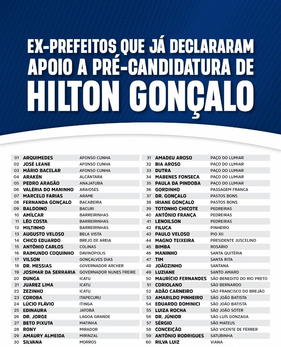 Com o slogan “Pelo Maranhão”, Hilton Gonçalo vem consolidando um movimento que ultrapassa fronteiras partidárias, reunindo prefeitos, ex-prefeitos, vereadores, lideranças comunitárias e representantes de diversos segmentos da sociedade civil.